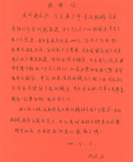5月13日下午,一封署名為鄧名兵的感謝信送至公司領(lǐng)導(dǎo)手中,信中詳細(xì)描述了公司倉管員歐小鳳拾金不昧的感人事跡,請(qǐng)求公司對(duì)歐小鳳進(jìn)行表揚(yáng),并感謝公司培養(yǎng)了歐小鳳這樣的好員工。
