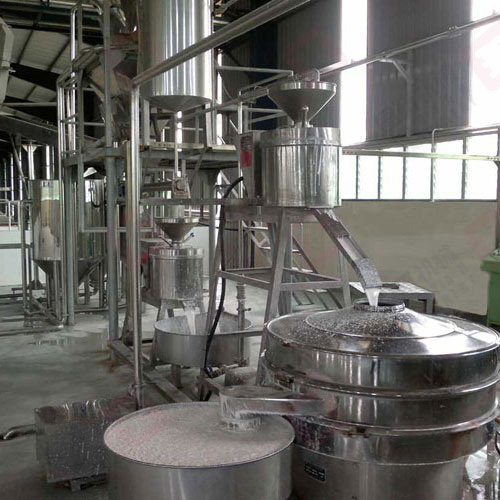 大米→提升→大米配送→泡米→射流輸送→清洗→除砂→米水分離→大米輸送→粉碎→旋風(fēng)分離→出料→儲料→提升→定量→加水?dāng)嚢琛鷥α陷斔汀嵘鷥α衔沽稀允臁鷶D絲→輸送→切斷掛桿→連續(xù)吊掛老化→轉(zhuǎn)桿→淋水→松絲→干燥→落桿→切斷→輸送→包裝→成品